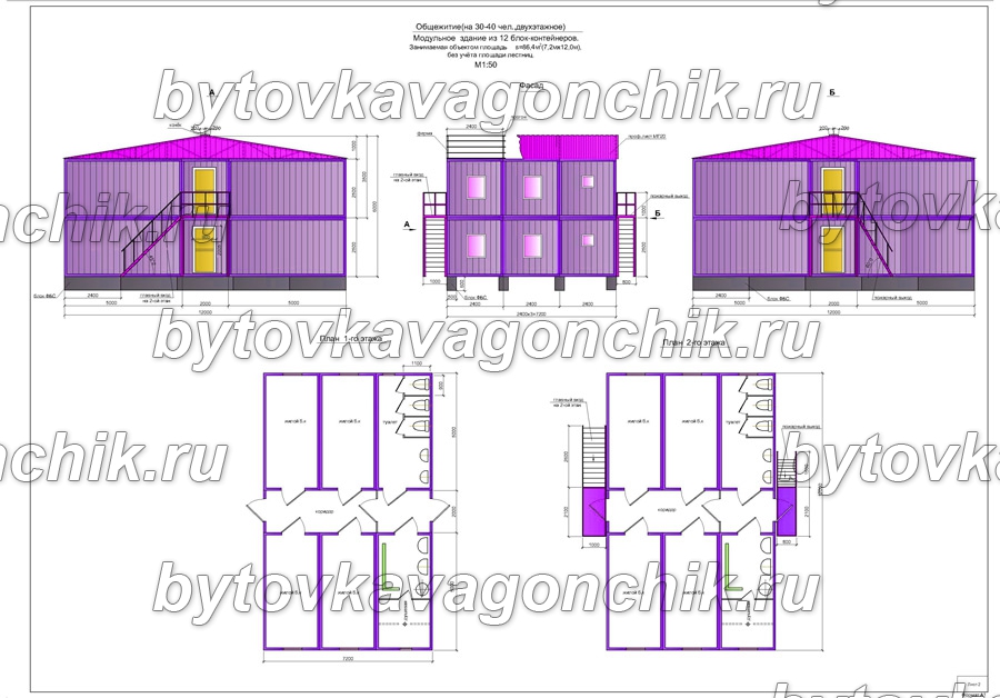 Фасады, план общежития на 30-40 человек, двухэтажное из 12 шт БК