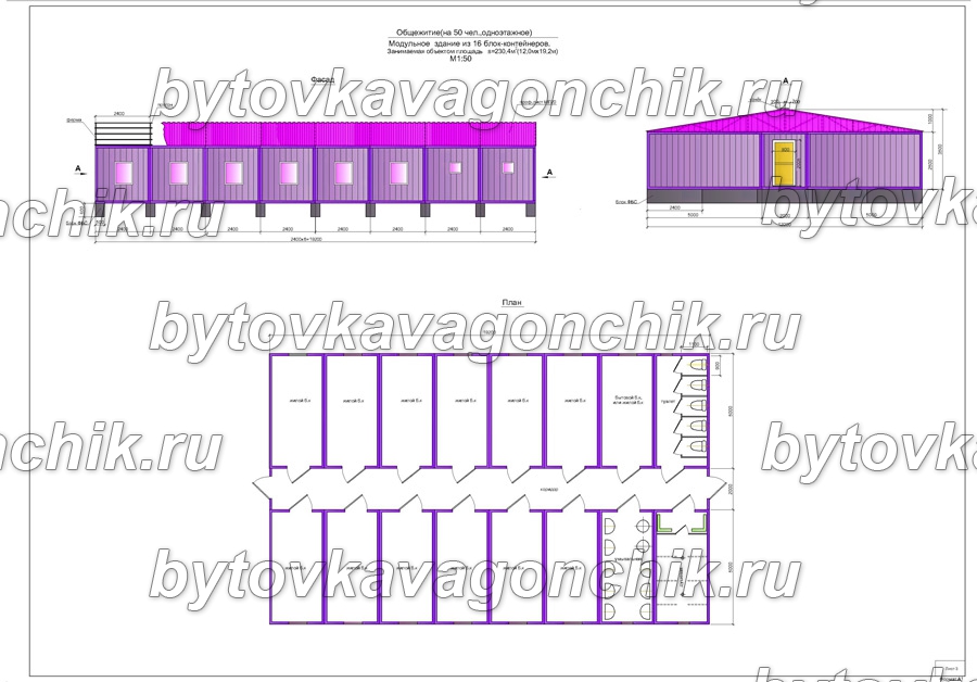 ГлавнаяПроекты готовых решенийМодульные здания → Фасады, план общежития на 50 человек, из 16 шт БК